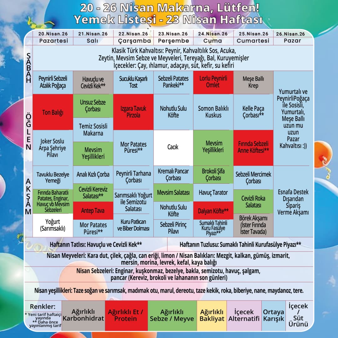 Bu hafta 23 Nisan’ın coşkusunu da içinde barındıran, mevsim sebzeleriyle zenginleşmiş, protein–karbonhidrat–lif dengesi gözetilmiş bir plan oluşturduk dostlar.