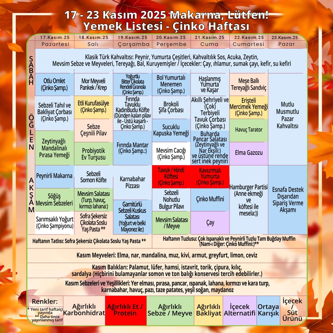 17–23 Kasım haftası, ailece bağışıklığı desteklemek ve soğuk havalara hazırlıklı olmak için tam bir fırsat dostlar. Bu haftalık yemek listesi, dengeli, sağlıklı ve doğal beslenmeyi pratik bir hale getiriyor.